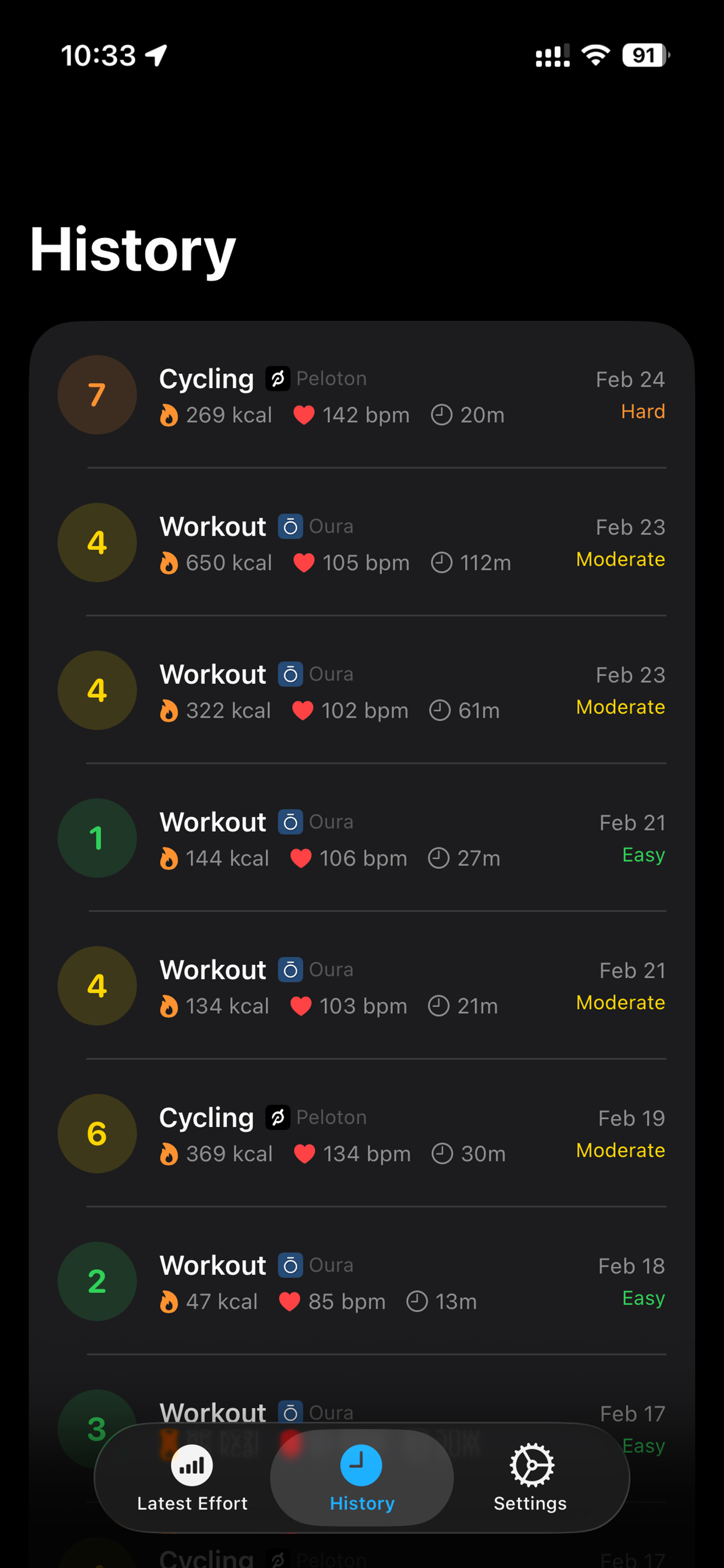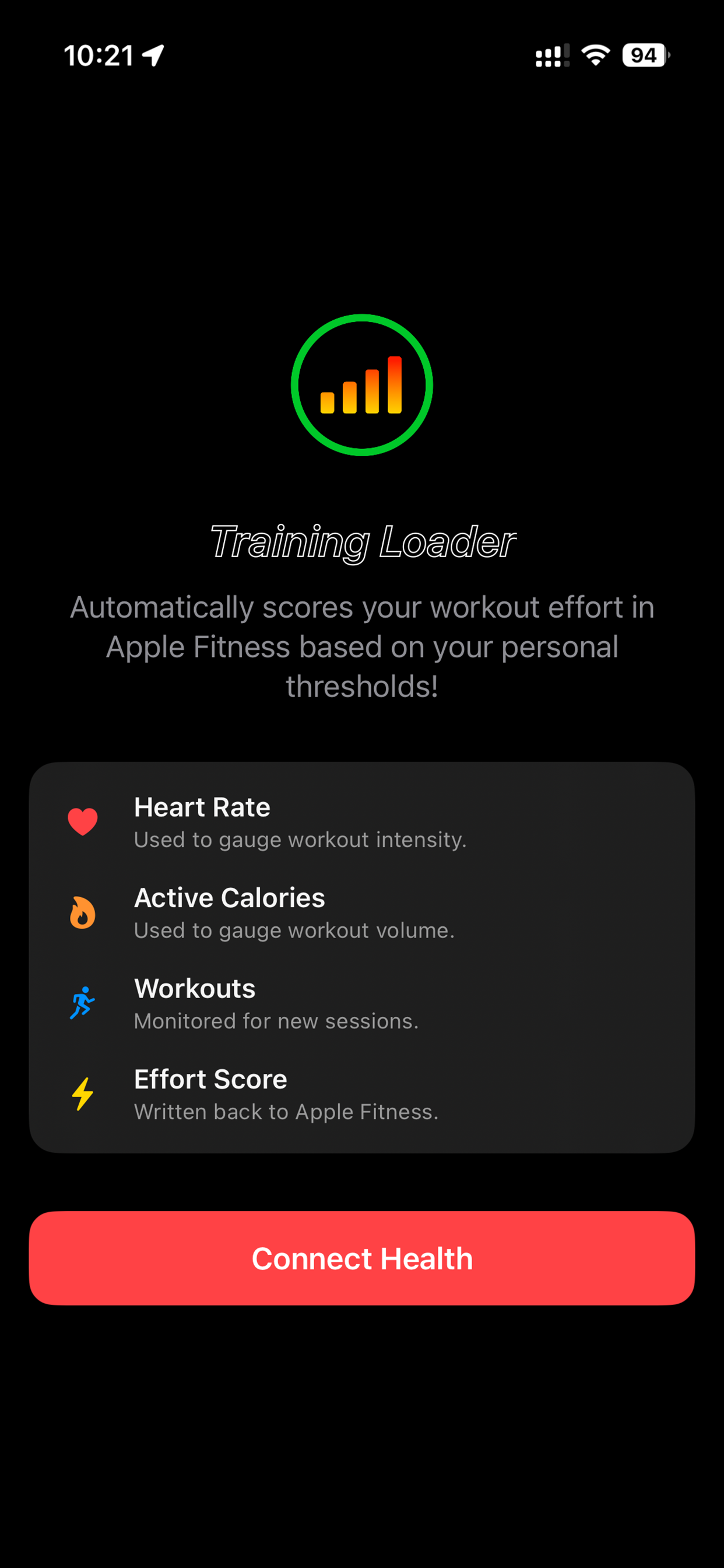 I love the "Training Load" feature of Apple Fitness, but it is dependent upon effort scoring, which I consistently forget to do. Especially when my workouts are flowing in from other fitness sources like Peloton, Oura, Slopes, Strava, etc.