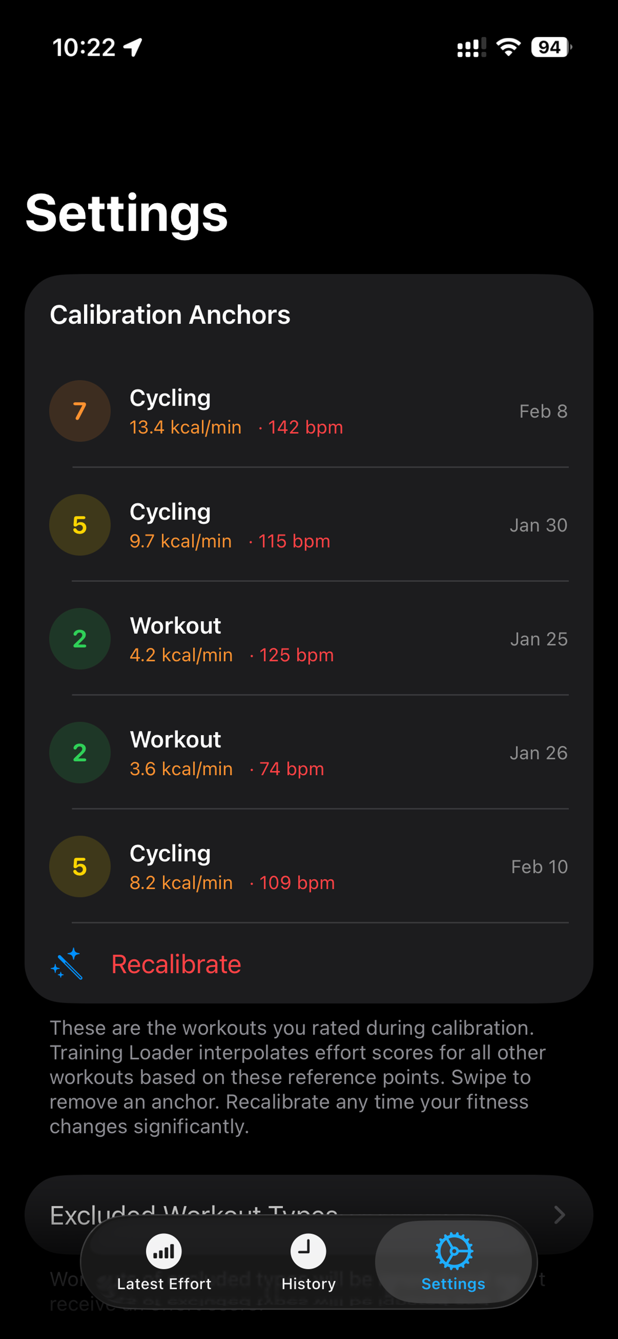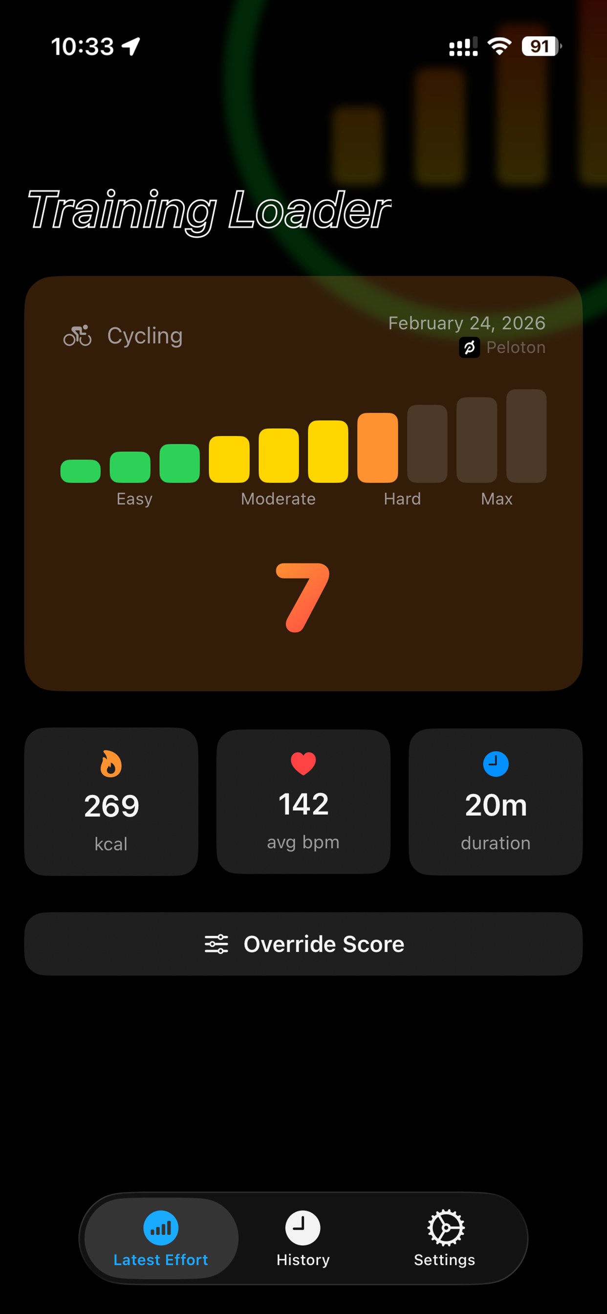 After calibrating the model against recent workouts, Training Loader automatically sets the workout effort score for you, in the background, based on caloric burn and average heart rate. You can also quickly override the score for any workout Training Loader sets for you.